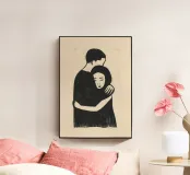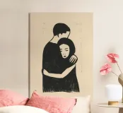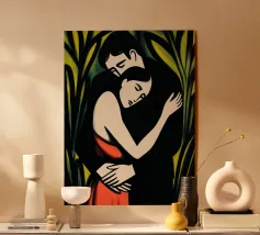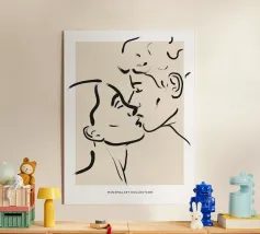 Due sagome si abbracciano in stretta e silenziosa vicinanza. Minimalista in nero su sfondo chiaro, la composizione cattura l'affetto, la sicurezza e l'intimità emotiva. Le linee chiare sottolineano l'armonia e il calore del momento.