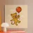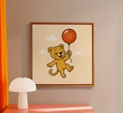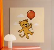 Un leone felice vola nel cielo con un palloncino rosso. Questo affascinante motivo fa sorridere e ricorda momenti spensierati e pieni di gioia.