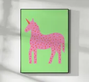 Questa giocosa illustrazione mostra un unicorno rosa con puntini su uno sfondo arancione e verde, perfetto per le camere dei bambini o per le decorazioni estive. La grafica dipinta a mano combina elementi fantasiosi con un design minimalista e crea un'atmosfera allegra che irradia gioia e creatività.