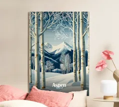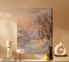 Questo incantevole dipinto digitale cattura la tranquilla bellezza di una foresta invernale. Alti e imponenti alberi di betulla bianca e di pioppo con i loro caratteristici segni neri si stagliano su uno sfondo di maestosi pini sempreverdi carichi di neve. Il terreno è ricoperto da una soffice e incontaminata coltre di neve, da cui spuntano piccoli pini giovani. La tavolozza di colori freddi e tenui, blu, bianchi e grigi, evoca un senso di tranquillità e di quieta solitudine, rendendo questo pezzo perfetto per chiunque ami la serena magia di un paesaggio innevato. È una scelta ideale per l'arredamento della casa, che aggiunge un tocco di inverno.