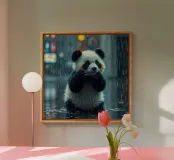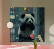 Un piccolo panda sta giocando in una pozzanghera, circondato da acqua piovana scintillante. Lo sfondo mostra luci colorate e una vibrante atmosfera cittadina in una giornata di pioggia.
