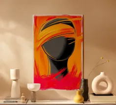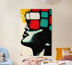 Un volto monocromo con le labbra chiuse appare estasiato, mentre audaci strisce di colore blu, giallo e rosa velano gli occhi. Lo stile pittorico espressivo con pennellate dinamiche conferisce al quadro un'energia esplosiva, come se la percezione tra realtà e astrazione fosse sfocata. Un gioco di contrasti, movimento ed emozione.