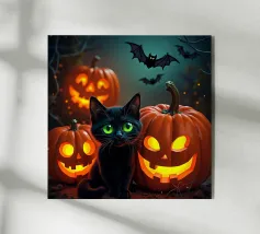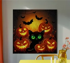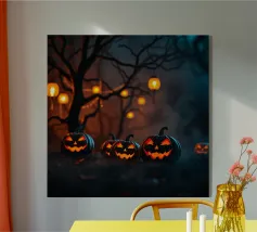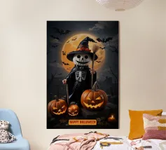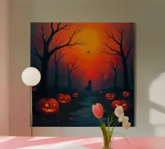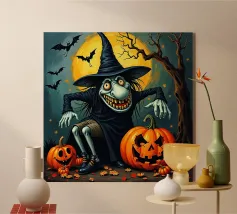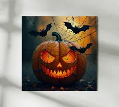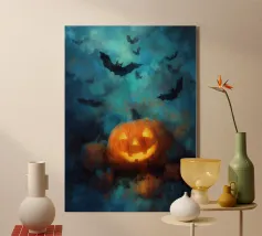 Al calare del crepuscolo, una strega in silhouette vola a cavallo della sua scopa tra i pipistrelli, con una zucca incandescente in primo piano, creando un'atmosfera incantevole.