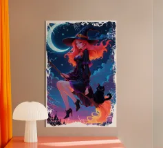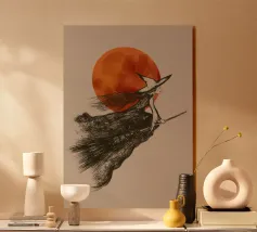 Una strega in controluce che vola su un manico di scopa in un pipistrello crepuscolare plexiglass