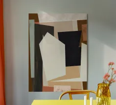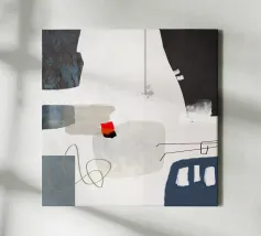 Composizione astratta con varie forme e linee geometriche. In particolare, un rettangolo blu con quadrati bianchi si trova vicino a una forma grigia traslucida accentuata di rosso. Una forma blu scuro dalla texture ruvida occupa la parte superiore sinistra. Lo sfondo è bianco sporco con sottili texture grigie.