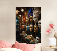 Una splendida collezione di maschere veneziane artigianali esposte in una sontuosa vetrina di legno. Gli intricati dettagli in oro, le ricche piume e i colori vivaci riflettono l'eleganza senza tempo del Carnevale di Venezia. Ogni maschera racconta una storia di mistero, tradizione e artigianato artistico. La calda illuminazione ambientale esalta il fascino del lusso, rendendo quest'opera d'arte perfetta per gli amanti del patrimonio europeo e dell'estetica teatrale. Un must per chi apprezza l'arredamento sofisticato e la bellezza culturale.