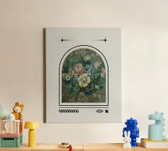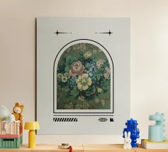 La terza opera della serie "Floral Framework" combina l'abbondanza floreale con un design strutturato. Un lussureggiante bouquet di rose, margherite e fiori di campo si dispiega in armoniose tonalità di verde. La cornice stilizzata sottolinea la grazia naturale e conferisce all'opera un'eleganza senza tempo. La combinazione di opulenza botanica e chiarezza grafica crea un'estetica rilassante e affascinante.