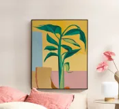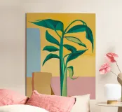 Una natura morta semplice ed elegante, incentrata su una rigogliosa pianta verde in un vaso beige, sullo sfondo di un solido giallo brillante per un audace tocco di colore.