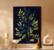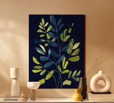 A luminous botanical abstraction featuring vivid green and teal leaves set against a deep midnight background. The interplay of color and brushstroke gives the composition an ethereal, glowing quality—like foliage illuminated under moonlight. Both vibrant and serene, this modern piece bridges organic motion with bold minimalism.