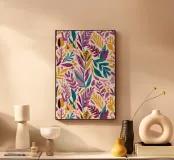 A dense, seamless pattern of stylized leaves and botanicals in a vibrant palette of purple, pink, and teal on a white background. The design is intricate and full of life.