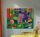 Two figures share a meal of eggs at a pink table in a room bursting with vibrant, maximalist detail. Surrounded by plants, books, and a record player, the scene is a symphony of bold colors and playful shapes, with a city view at night visible through the window.