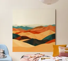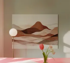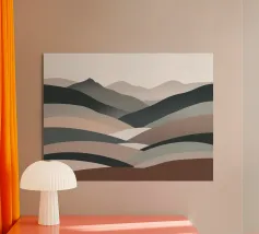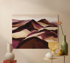 Uno studio minimalista di colline ondulate e vallate costeggiate da vigneti, reso in calde ocre, prugne profonde e tenui tonalità della terra. Ispirate ai paesaggi delle campagne vinicole, le forme pulite e i morbidi gradienti evocano la calma solare dei campi fertili e delle vendemmie, distillando l'essenza della viticoltura rurale in una forma pura e astratta.