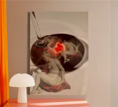Collage di elementi di design analogici e digitali in un'estetica da rivista patinata.