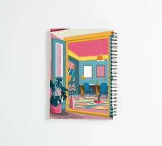 A modern and stylish interior is viewed from another room, showcasing a vibrant interplay of colors, contemporary furniture, and art, creating a sophisticated and layered scene.
