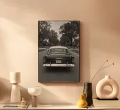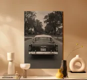 Vista posteriore di un'auto d'epoca su una strada in bianco e nero plexiglass