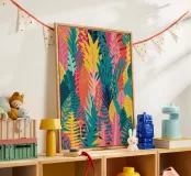 A vivid and dense pattern of tropical leaves and flowers in a full spectrum of colors creates an energetic, joyful, and immersive jungle experience.