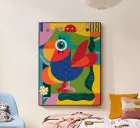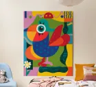 In "Geometric Aviary," the abstract elegance of a stylized bird takes flight through a vibrant tapestry of colors and shapes. The bird, crafted from a kaleidoscope of blue, red, orange, green, and yellow geometric forms, gazes out with a large, circular eye adorned with a black star-like pattern. Its red beak and polka-dotted wings add a touch of whimsy to the composition.