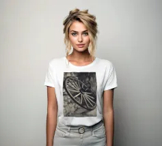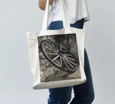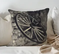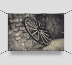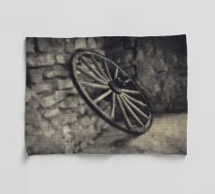 A shallow focus shot of an old spoked wooden waggon wheel in a stone barn in France.