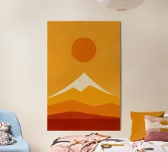 Un paesaggio desertico astratto con sabbia in primo piano e montagne rosse e gialle sullo sfondo. Sensazione di Giappone minimalista