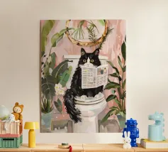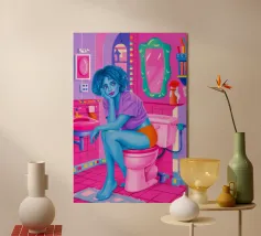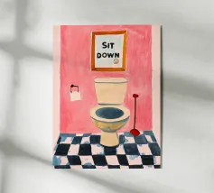 Un poster umoristico per il bagno in tenui colori pastello con l'allegro testo "Sit down" invita a sorridere nella toilette degli ospiti. Con una grafica minimalista, carta igienica ed elementi disegnati a mano, crea un'atmosfera divertente e invia un chiaro messaggio contro l'alzarsi per fare pipì!