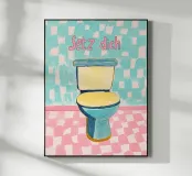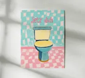 Un biglietto illustrato umoristico per il bagno degli ospiti: "Siediti, non fare pipì in piedi!". - in colori pastello e design minimalista, perfetto per un bagno moderno.