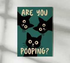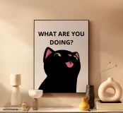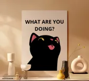 Un gatto nero con occhi gialli e orecchie rosa guarda in alto con un'espressione curiosa. Sopra il gatto "COSA STAI FACENDO?".