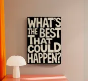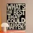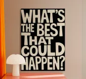Design tipografico con la scritta "WHAT'S THE BEST THAT COULD HAPPEN?" in lettere maiuscole grandi e decise color crema su sfondo nero. Impilate verticalmente e leggermente sfalsate, le lettere creano una dichiarazione moderna, accattivante e potente.