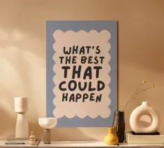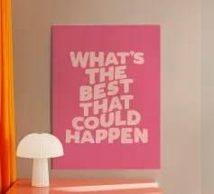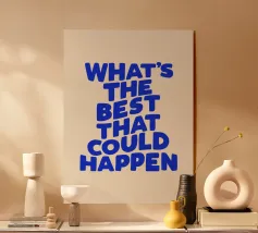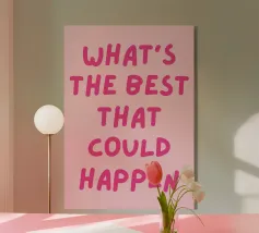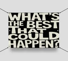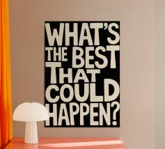 Design tipografico con la scritta "WHAT'S THE BEST THAT COULD HAPPEN?" in lettere maiuscole grandi e decise color crema su sfondo nero. Impilate verticalmente e leggermente sfalsate, le lettere creano una dichiarazione moderna, accattivante e potente.