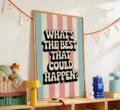 Poster d'epoca con la scritta "Projection: What's the Best That Could Happen" (Proiezione: il meglio che potrebbe accadere) in una tipografia retrò degli anni '70. Le strisce rosa e blu, i colori pastello e l'ampio spazio bianco creano un design retrò elegante e giocoso con un'estetica moderna.