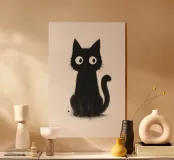 A small black kitten sits upright with an alert, curious posture, its oversized white eyes giving it a bright, endearing expression. The fur is rendered with soft, inky textures and subtle splatter details, creating a hand-painted, slightly messy charm. Its tail curls gently to the side, and the clean white background makes the dark silhouette and expressive features stand out with simple, whimsical clarity.