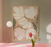 Stylized white flowers gracefully unfold across a soft beige background, accompanied by dark green leaves. The design features elegant line work that highlights the delicate nature of the petals.