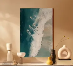 Quest'opera d'arte cattura il ritmo dinamico dell'oceano attraverso una prospettiva dall'alto verso il basso, in cui i surfisti si fanno strada attraverso un'onda potente e spumeggiante. Il contrasto tra il blu intenso dell'acqua, il bianco lattiginoso delle onde e le sfumature sabbiose crea un flusso visivo sorprendente, che sembra allo stesso tempo energico e meditativo. Le texture pittoriche ammorbidiscono il movimento, trasformando un momento fugace in una composizione astratta di movimento ed equilibrio. L'opera esplora il rapporto tra la scala umana e la forza naturale, rendendola ideale per interni contemporanei, spazi costieri e stampe artistiche di grande formato.
