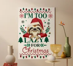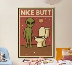 Un alieno con cappello da Babbo Natale e maglione natalizio è circondato da fiocchi di neve e alberi di Natale. Il disegno chiede ironicamente: "Perché il tappeto è tutto bagnato?" con colori festosi.