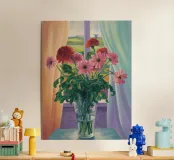 Pink daisies stand poised in a glass vase on a window sill, basking in soft curtain-filtered light.