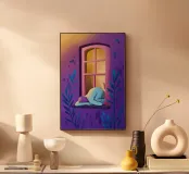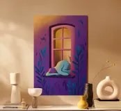 Una figura inginocchiata alla finestra, che guarda fuori al calar del sole, con la stanza immersa in un bagliore violaceo dovuto alla luce che si affievolisce, creando una scena struggente di contemplazione, desiderio o tranquilla osservazione.