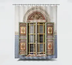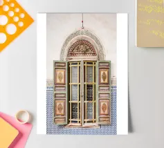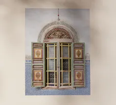 Finestre e schermi. Piastrelle blu e architettura marocchina decorata. Fotografia di strada in Marocco.