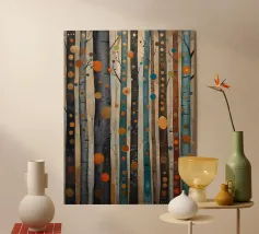Tall birch trees with distinctive black and white bark stand in a snowy forest. A small bird leaves tracks in the snow under the tree canopy. The scene is composed with geometric shapes and muted colors.