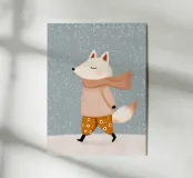 A charming fox walks peacefully through falling snow, eyes gently closed as if enjoying a crisp winter day. Wrapped in a soft dusty-rose scarf that flows in the breeze, the fox wears warm golden trousers adorned with delicate white floral details, adding a subtle boho touch.