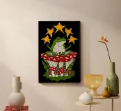 Rana zen seduta su un fungo rosso con stelle dorate. Ognuno ha la propria interpretazione di questo disegno, quindi lascio a voi la scelta. Ottimo regalo e decorazione per la parete del dormitorio o della camera da letto.
