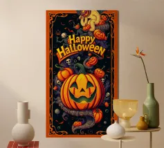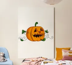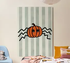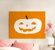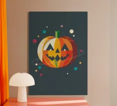 Un'allegra zucca di Halloween dai colori vivaci e dalle forme geometriche: moderna, giocosa e ideale per i temi autunnali di Halloween.