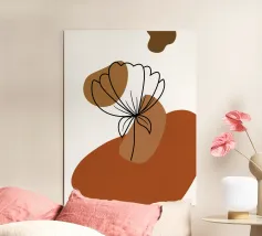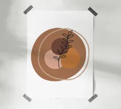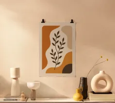 Una composizione astratta presenta un semplice sfondo geometrico marrone e beige con un delicato disegno al tratto di un ramoscello frondoso. Il design minimalista enfatizza gli elementi naturali in un equilibrio armonioso.