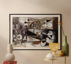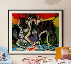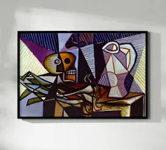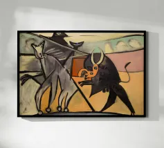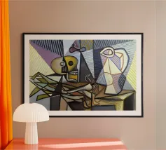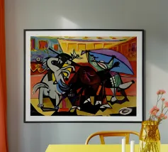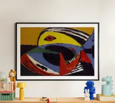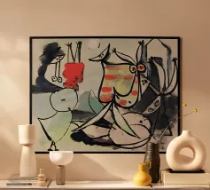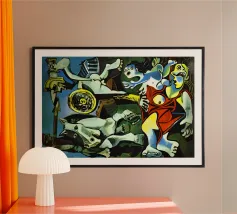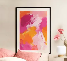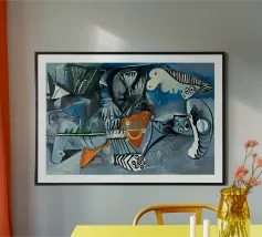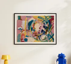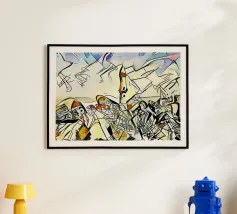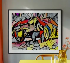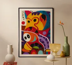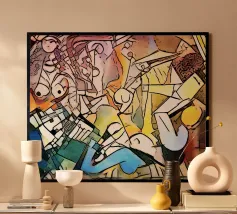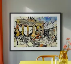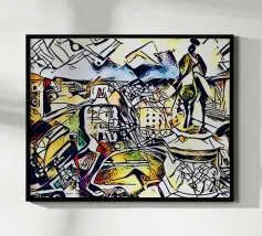Questo dipinto astratto vibrante ed energico presenta un gioco dinamico di forme frammentate e linee audaci, con una ricca tavolozza di arancioni, gialli, viola e blu. La composizione suggerisce elementi decostruiti, forse figure o oggetti, in un movimento vorticoso ed energico, caratteristico delle influenze cubiste ed espressioniste astratte. I dettagli intricati e i colori contrastanti creano un'esperienza visiva accattivante e stimolante. Questo poster digitale di alta qualità (7000x5000 pixel, 300 dpi) cattura magnificamente l'energia grezza e il genio artistico dell'originale, ma