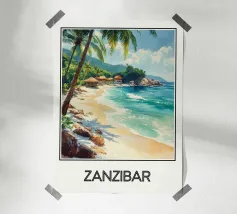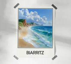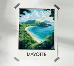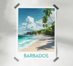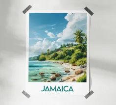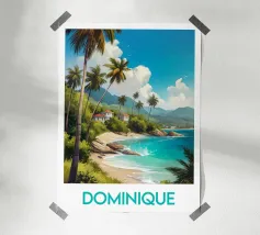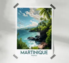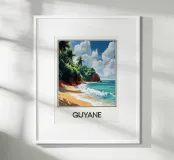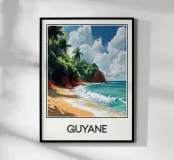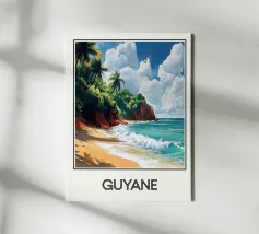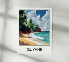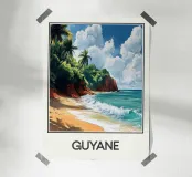 Poster decorativo che raffigura una spiaggia selvaggia della Guyana francese, circondata da scogliere rossastre e palme rigogliose, con onde turchesi che si infrangono sulla sabbia dorata. Un paesaggio tropicale accattivante, perfetto per creare un'atmosfera esotica e rilassante nella vostra casa.