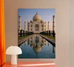 An elegant illustration of the Taj Mahal, a symbol of love and grandeur, with its captivating reflection in the surrounding pool. A tribute to Indian architecture and heritage, perfect for a refined, timeless wall decoration.