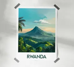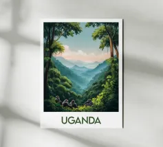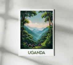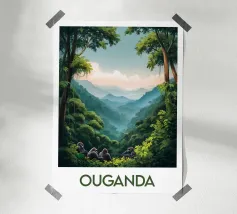 Poster di viaggio raffigurante l'Uganda, con le sue montagne nebbiose, la giungla lussureggiante e il gruppo di maestosi gorilla. Ideale per una decorazione murale selvaggia e misteriosa.