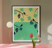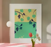 Il design unico presenta una vite rigogliosa con uccelli appollaiati tra le foglie.