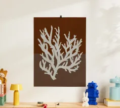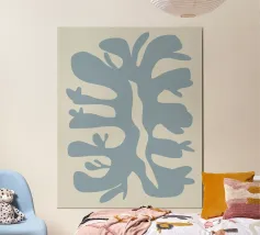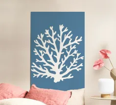 Opera d'arte minimalista con alghe bianche astratte o forme simili a coralli su uno sfondo grigio-blu tenue. Perfetto per un'estetica moderna e organica.