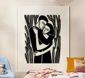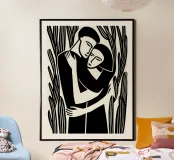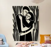 Questa imponente opera celebra il legame umano attraverso la radicale riduzione al bianco e nero. Lo stile si ispira inequivocabilmente all'espressionismo xilografico dei primi del Novecento, di artisti come Ernst Barlach e Käthe Kollwitz, pur possedendo l'eleganza grafica dell'epoca Art Déco. Le linee chiare e le forme chiuse e contrastanti creano un'impressione scultorea e concentrano tutta l'energia emotiva sull'abbraccio centrale. La composizione irradia una profonda malinconia e una calma senza tempo.