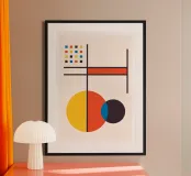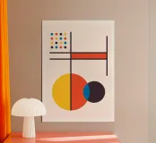 Un manifesto astratto altamente evocativo dei movimenti Bauhaus e Suprematismo, che richiama le composizioni di artisti come Kandinsky e Malevich. Il disegno presenta una disposizione dinamica di forme geometriche audaci: due grandi cerchi sovrapposti (giallo e vermiglio/rosso) che intersecano un cerchio nero più piccolo, tutti sostenuti da una linea nera centrale verticale e orizzontale. Un rettangolo rosso prominente sottolinea la linea orizzontale principale. In alto a sinistra, una griglia di piccoli quadrati in colori primari e secondari aggiunge un contrappunto dettagliato. Questo download digitale di alta qualità (7000x5000 pixel, 300 dpi)
