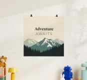 Arte di montagne e alberi con testo 'Adventure Awaits' (L'avventura ti aspetta) poster con telaio in legno
